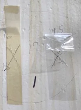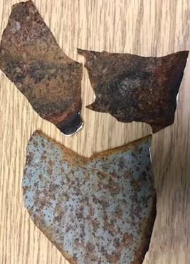 Back side of paint chips revealing rust. Indicative of inadequate surface cleaning prior to first paint job
